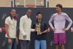卡斯?fàn)栕罴研滦悛勵C發(fā)現(xiàn)場,大衛(wèi)-羅賓遜(89-90最佳新秀)、鄧肯(97-98賽季最佳新秀)、文班亞馬(23-24賽季最佳新秀)三位馬刺隊(duì)史最佳新秀獎獲得者給他頒獎。