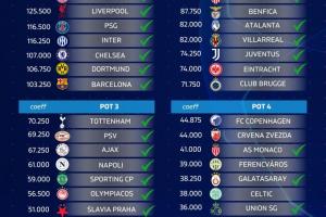 體育資訊05月26日訊 凌晨五大聯(lián)賽全部收官,下賽季的36個歐冠席位已經(jīng)確定29隊,媒體FootRankings根據(jù)歐戰(zhàn)積分算出了29隊的分檔情況。