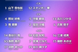 前鋒:15-上野真實(shí)(廣島三箭女足)、19-中嶋淑乃(廣島三箭女足)、13-矢形海優(yōu)(仙臺(tái)七夕女足,首次入選)、17-濱田芽來(lái)(RB大宮松鼠女足,首次入選)、16-大澤春花(斯圖加特女足,首次入選)、9-山本柚月(東京綠茵女足)、20-愛(ài)川陽(yáng)菜(神戶雌獅,首次入選)、18-樋渡百花(東京綠茵女足,首次入選)