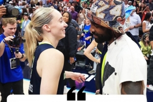 在本場比賽中,獨行俠球星歐文現(xiàn)場為飛翼狀元秀佩奇助威,賽后二人還一起合影、擁抱致意。
