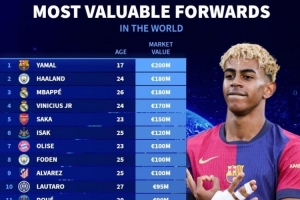 體育資訊6月30日訊 《轉(zhuǎn)會市場》統(tǒng)計了最新的鋒線球員身價情況,巴薩17歲小將亞馬爾以2億歐元獨(dú)自領(lǐng)跑。