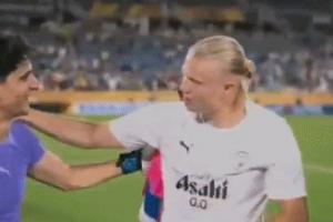 賽后哈蘭德?lián)е寂奶?。本?chǎng)比賽哈蘭德打進(jìn)一球,而布努本場(chǎng)神勇發(fā)揮貢獻(xiàn)10次撲救。