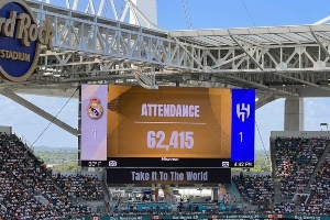 世俱杯小組賽第1輪,皇馬在硬石體育場1-1利雅得新月,現(xiàn)場觀眾為62415人,球場容量為65000人,上座率96.02%。