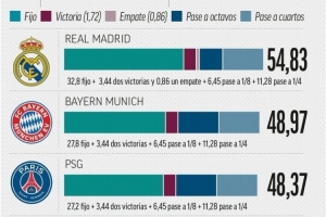 皇馬5483萬歐元:參賽保底獎金3280萬、贏球獎金344萬、平局獎金86萬、晉級16強獎金645萬、晉級8強獎金1128萬
