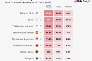 體育資訊4月10日訊 OPTA預(yù)測(cè)了本賽季歐聯(lián)杯奪冠概率,熱刺17.2%排第三,曼聯(lián)15%排第四。