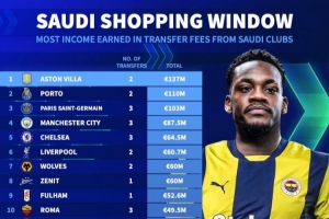 各隊向沙特賣人收入榜:維拉1.37億歐居首,波爾圖巴黎二三位