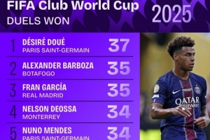 體育資訊7月11日訊 本屆世俱杯僅剩巴黎vs切爾西的決賽,數(shù)據(jù)機構(gòu)squakwa也統(tǒng)計了本屆賽事成功對抗情況,巴黎20歲前鋒杜埃領(lǐng)跑。