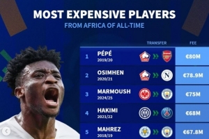 德轉(zhuǎn)列非洲球員歷史轉(zhuǎn)會(huì)費(fèi)榜:歐元