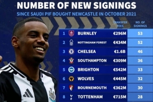 德轉(zhuǎn)列沙特入主紐卡后英超引援人數(shù)榜:身價(jià)(歐元)