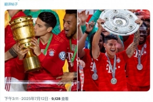 拜仁官方社媒曬出J羅效力球隊時期的捧杯照片,配文:“祝J羅34歲生日快樂!”